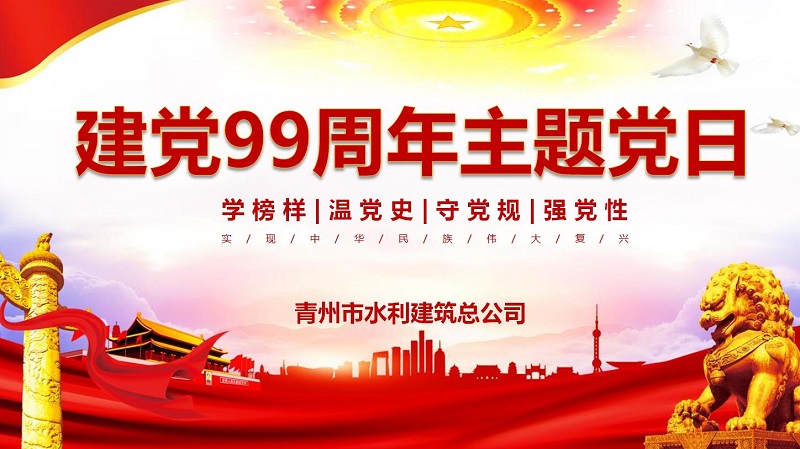 为纪念中国共产党建党99周年,青州市水利建筑总公司举办“学习榜样,纪念中国共产党成立99周年”主题党日系统活动。活动共分三个阶段,第一阶段集中学习,第二阶段为7月份入党党员共同过“政治生日”,第三阶段组织党员到包靠社区开展志愿者服务活动。