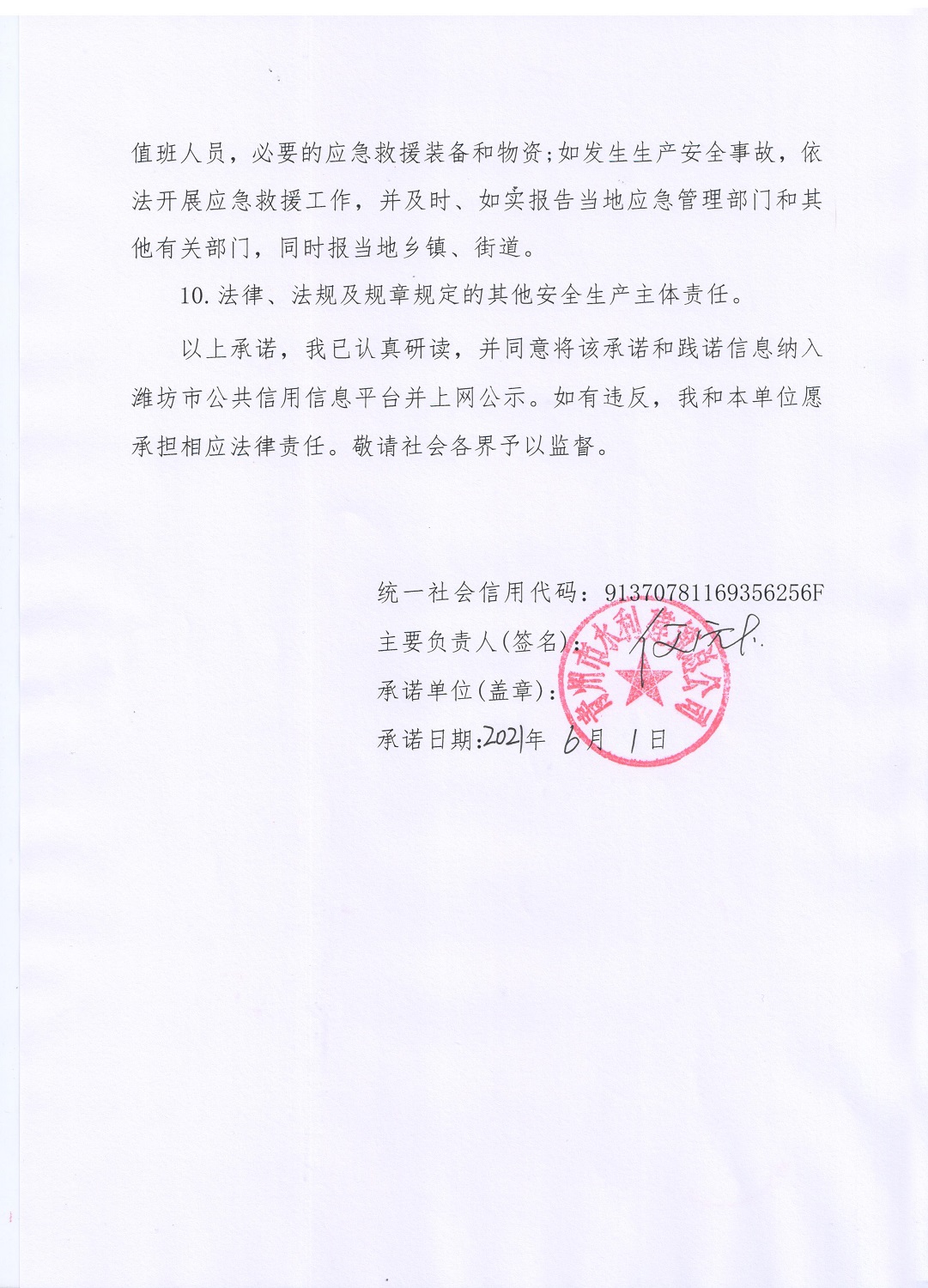 青州市生产经营单位安全生产信用承诺书